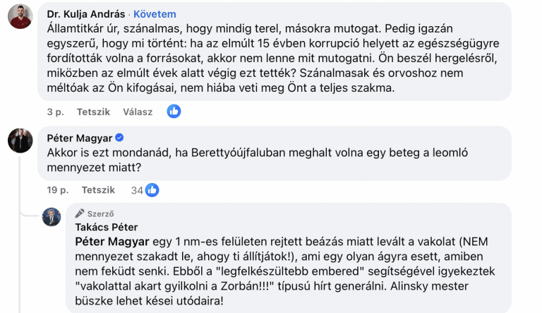 Reagált Takács Péter államtitkár arra a Facebook-bejegyzésre, amelyben Kulja András orvos-politikus arról számolt be, hogy leszakadt a plafon a berettyóújfalui kórház pszichiátriai osztályán. A poszt szerint a beteg élete csak a szerencsén múlott. Kulja szerint a dolgozók már korábban is jelezték a problémákat, ám csupán ígéreteket kaptak. Takács Péter államtitkár szerint viszont csak „átmeneti üzemzavarról” és „kisebb üzemeltetési nehézségekről” van szó, szerinte a hírt politikai hisztériakeltés céljából dramatizálták. Az eset újabb vitát robbantott ki a Tisza Párt és a kormány között.